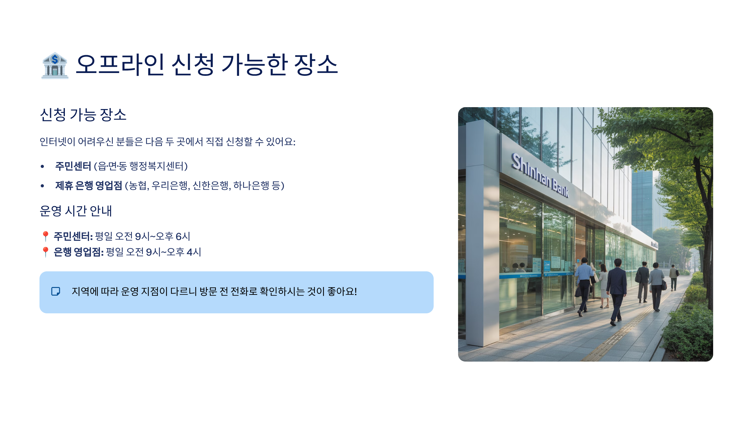 인터넷이 어려우신 부모님은 가까운 주민센터(읍·면·동)나 제휴 은행 영업점에서 직접 신청할 수 있어요. 💁