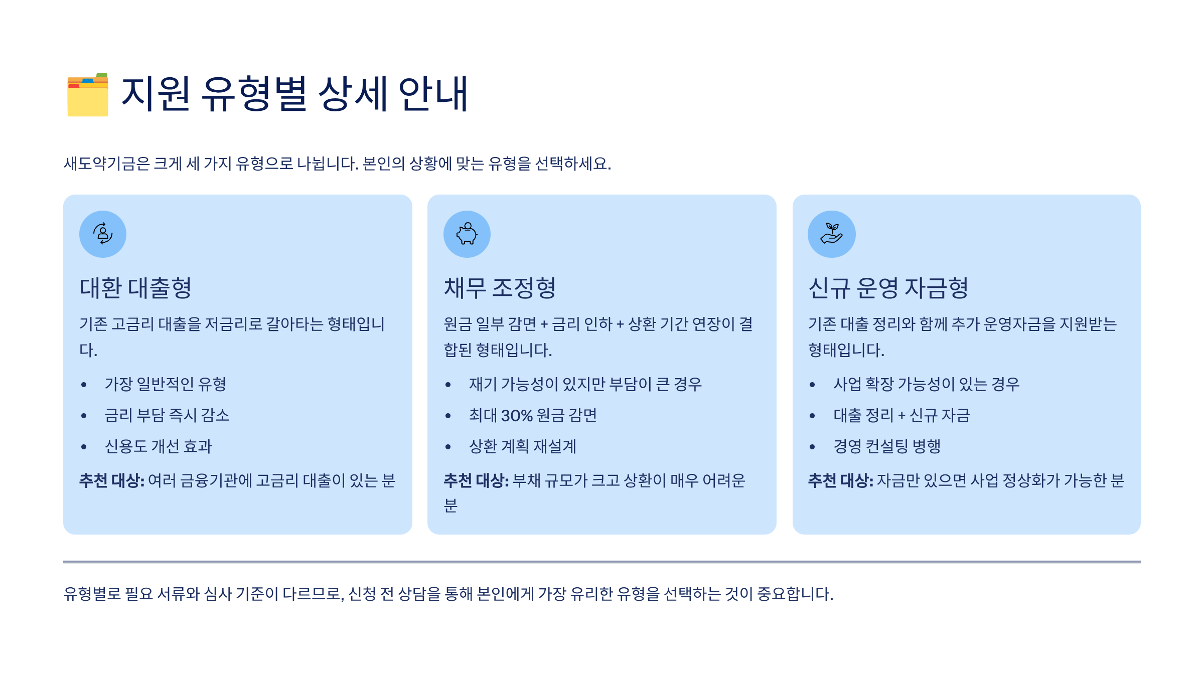 새도약기금은 총 3가지 지원 유형으로 나뉘어요. 각각의 유형은 신청자의 상황에 맞춰 다르게 적용되기 때문에, 본인에게 어떤 유형이 해당하는지 정확히 파악하는 게 매우 중요해요. 🔍