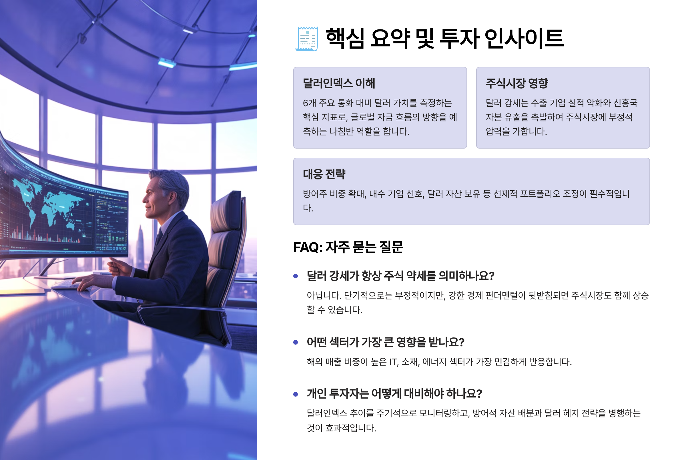 지금까지 달러인덱스가 상승할 때 주식시장에 어떤 영향을 주는지, 왜 그런 일이 벌어지는지를 살펴봤어요. 핵심만 콕 집어서 정리해드릴게요!