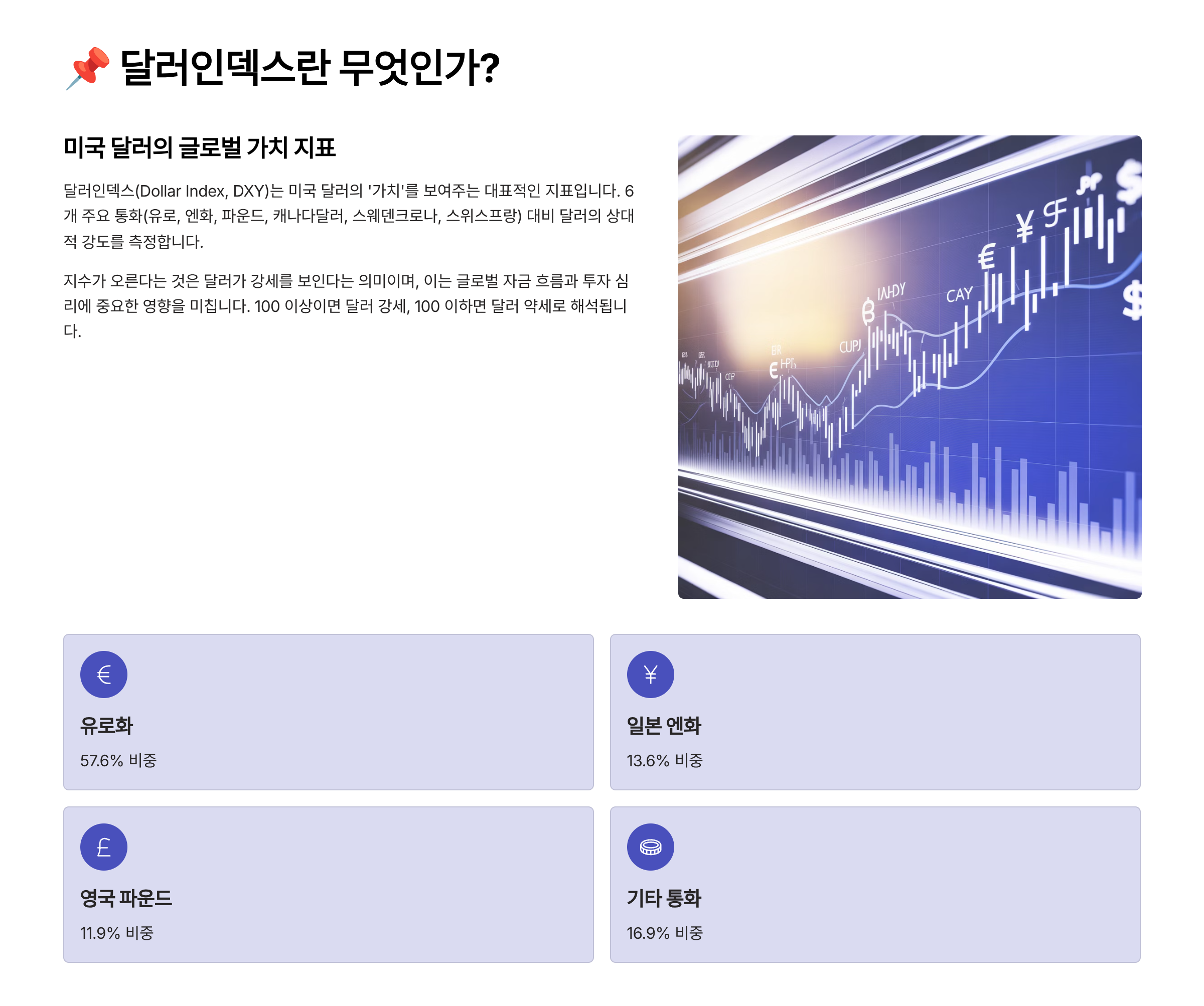 달러인덱스는 환율뿐 아니라 주식, 금, 원자재, 부동산, 해외 ETF 투자자들에게도 매우 중요한 지표예요. 특히 미국 금리 인상기에는 DXY 수치가 상승하면서 여러 시장에 영향을 주기 때문에, 주식 투자자도 이 지표를 반드시 살펴야 해요.