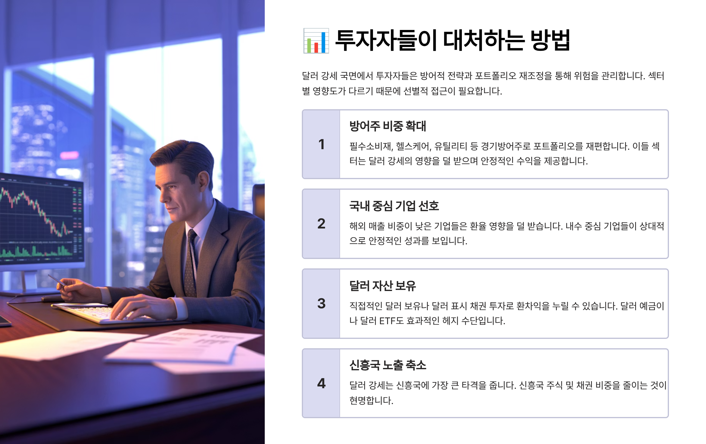 다음 섹션에서는 달러인덱스가 상승할 때, 투자자들이 어떻게 대처하면 좋을지 실제 전략과 자산 선택법을 알려드릴게요.📊