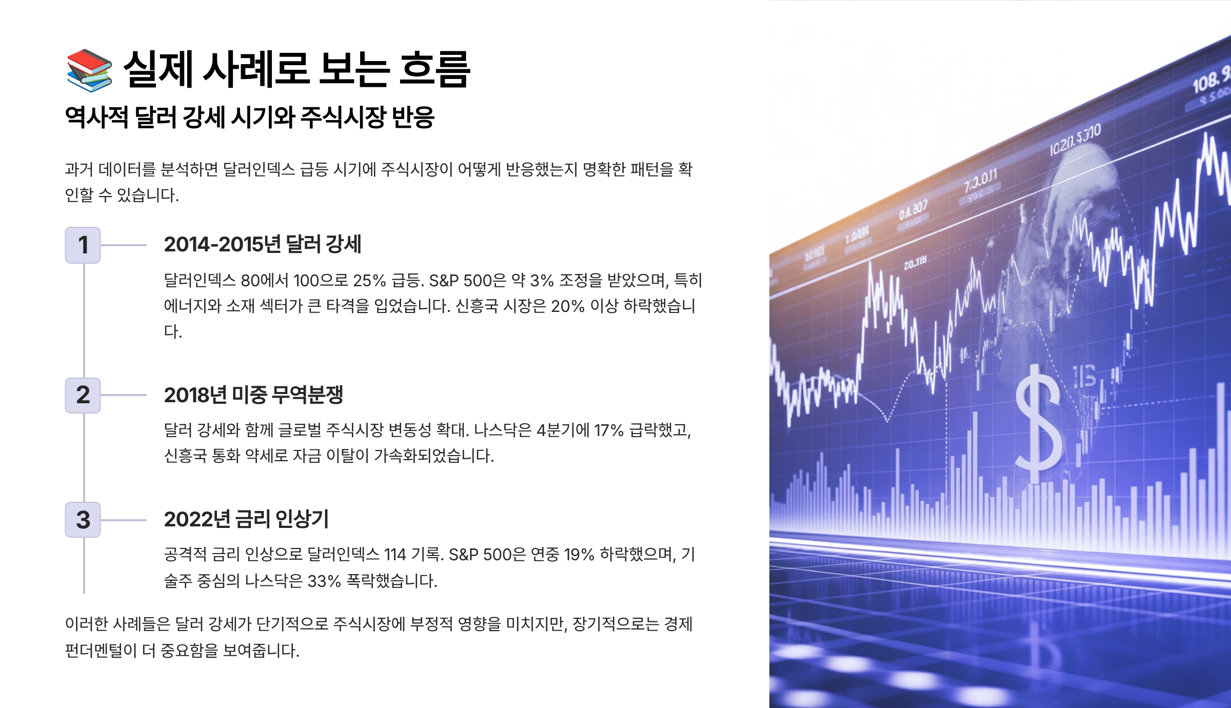 💬 예를 들어 2015년 미국이 첫 금리 인상을 단행할 당시에도 DXY는 강세를 보였고, 신흥국 증시가 크게 흔들렸죠. 반면 2020년 팬데믹 이후 달러 약세가 나타나자 성장주 중심의 나스닥이 빠르게 반등하기도 했어요.