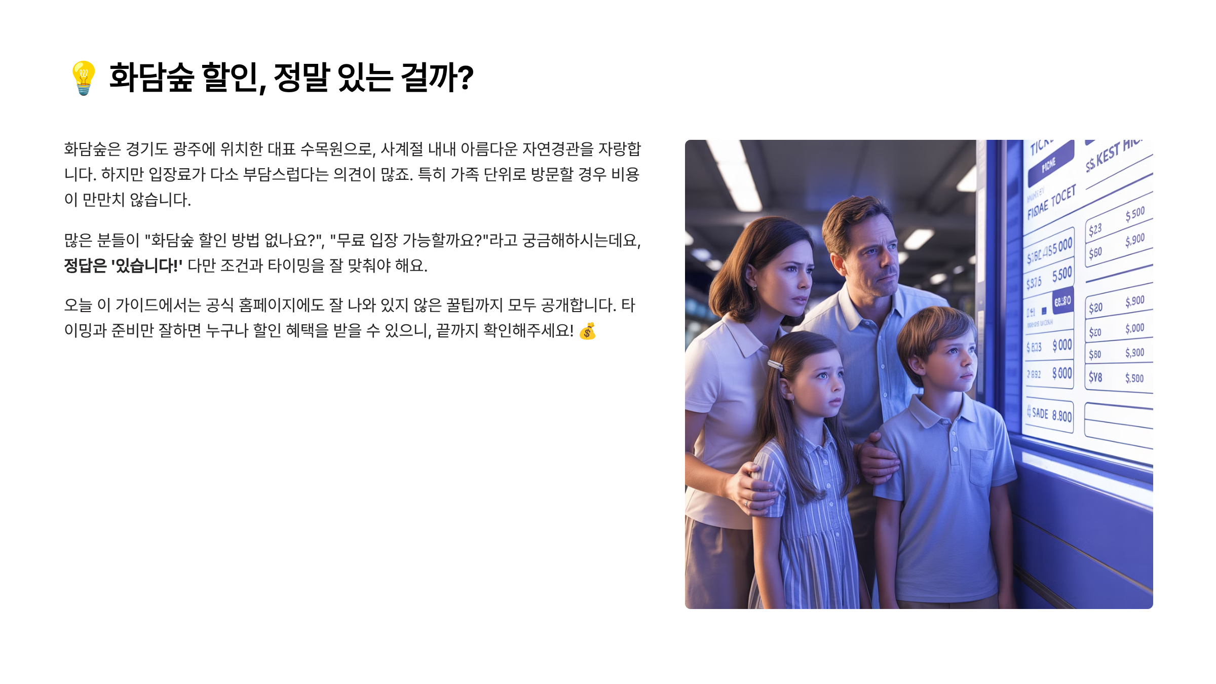 그래서 많은 분들이 '화담숲 할인 없나요?', '무료 입장 가능한 방법 있나요?'라고 검색하시는데요, 정답은 '있긴 해요, 다만 조건이 있어요!' 😎