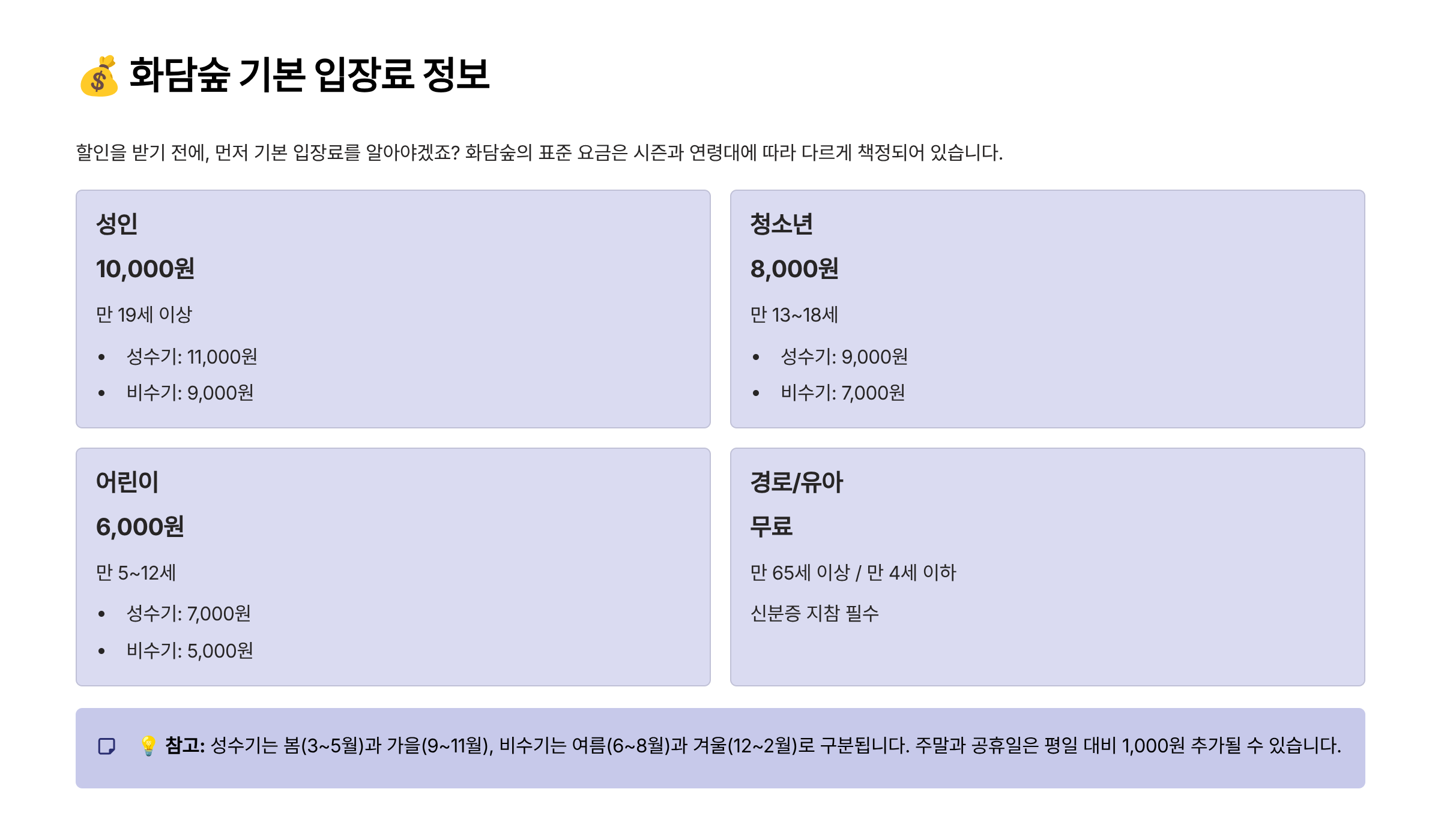 본 게시물은 2025년 기준 화담숲 공식 홈페이지 및 제휴 플랫폼, 카드사 정보 등을 기반으로 작성된 정보 안내글이며, 실제 혜택은 시기에 따라 변동될 수 있어요. 정확한 내용은 반드시 공식 홈페이지 또는 고객센터를 통해 확인해주세요.