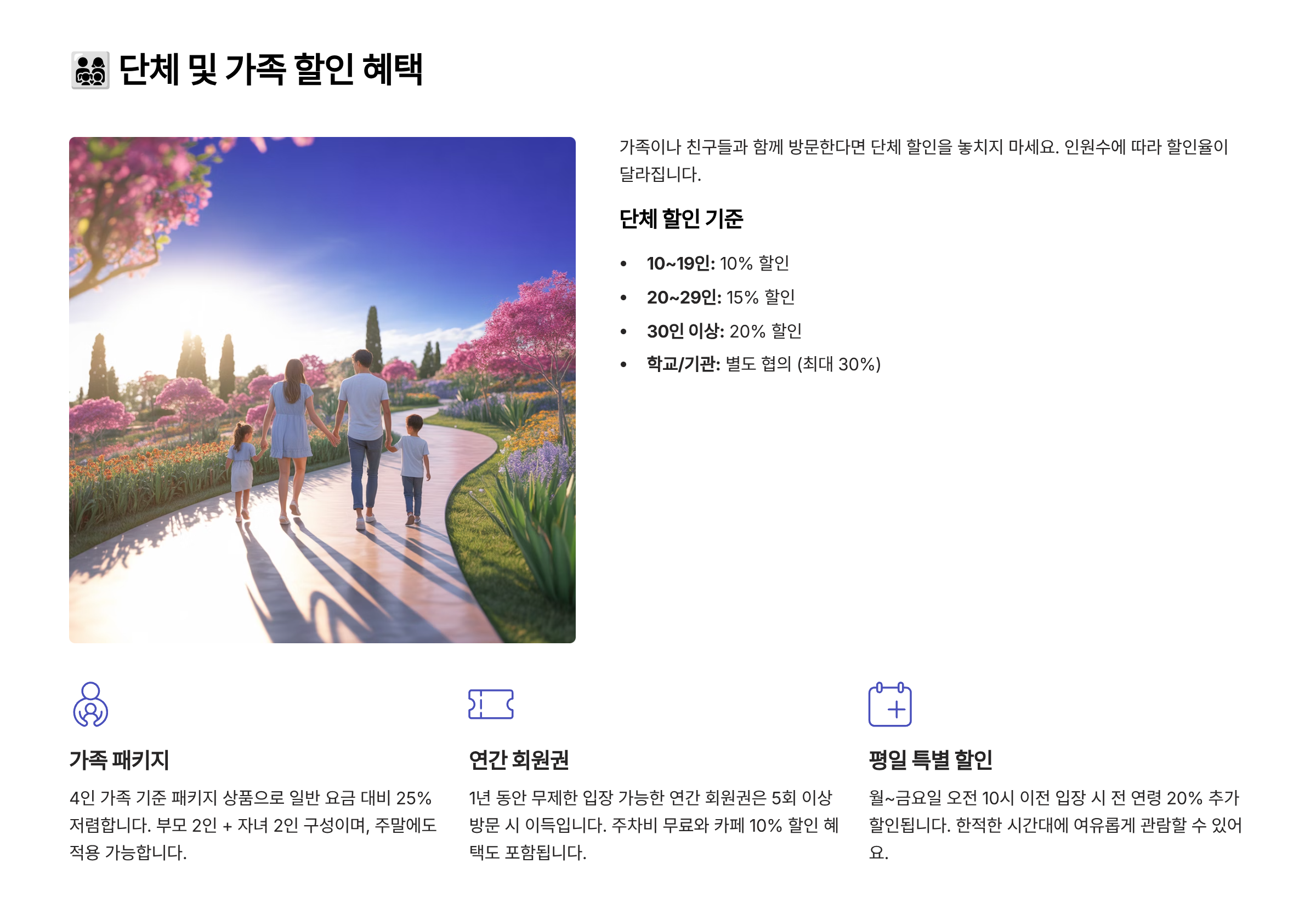 | 가족 방문 이벤트 | 시즌별 변동 | 가정의 달, 어린이날 등 |