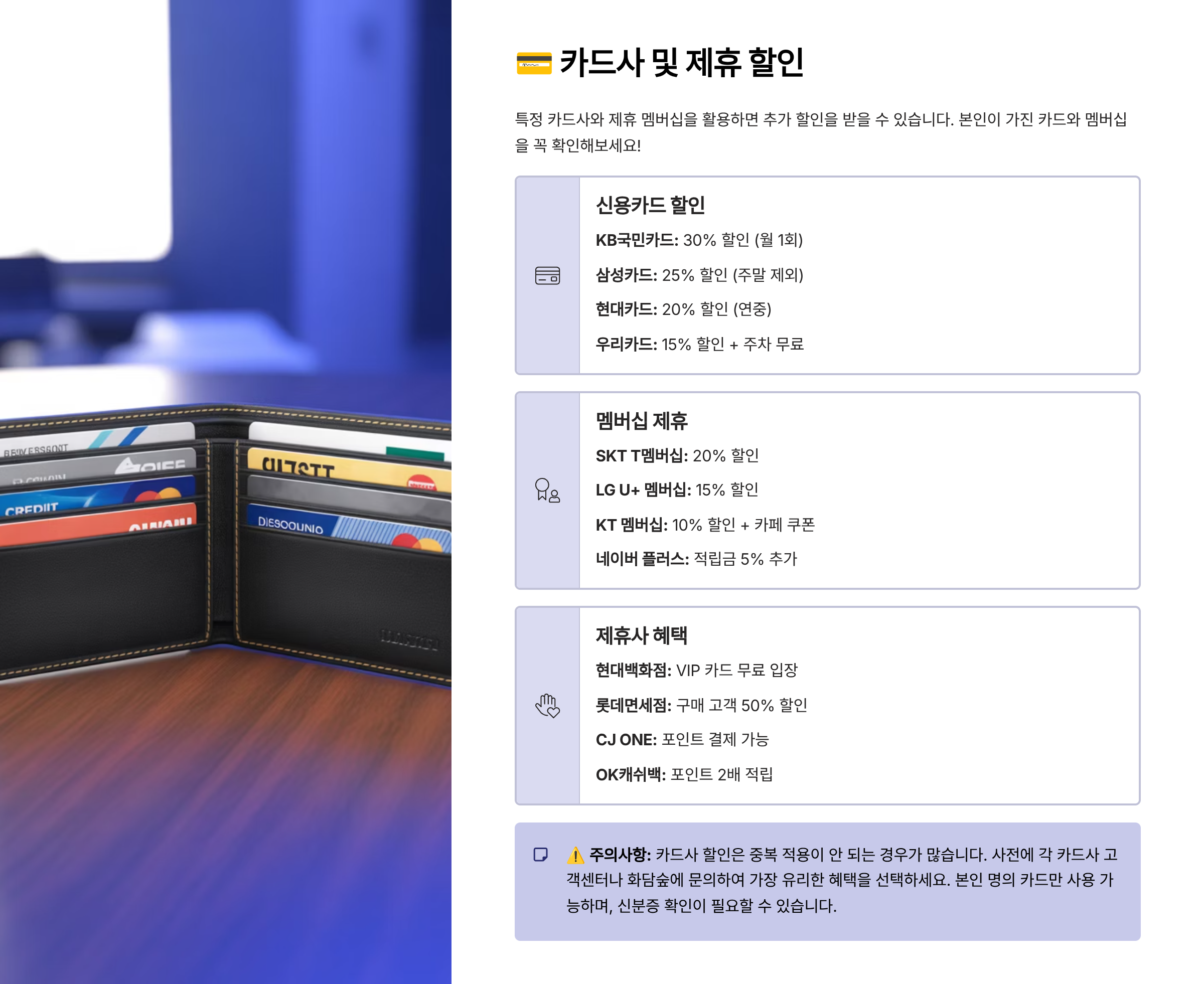 다만 이런 할인은 항상 적용되는 건 아니고, 제휴 이벤트가 열렸을 때만 가능해요. 그래서 방문 전 해당 카드사 홈페이지에서 꼭 이벤트를 확인해야 해요! 🔍