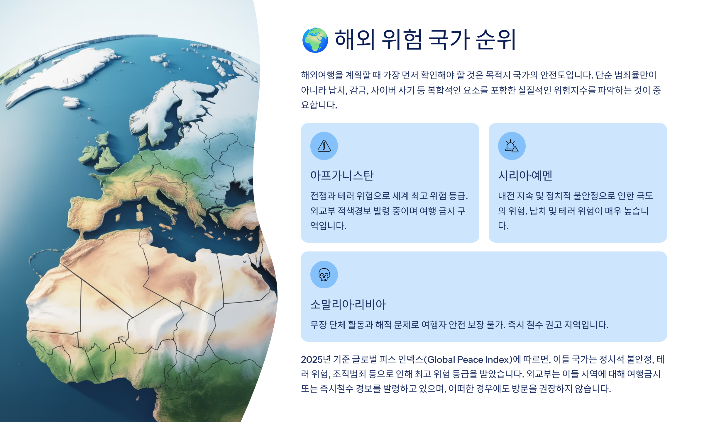 2025년 기준 국제 NGO인 글로벌 피스 인덱스(Global Peace Index)와 외교부 여행경보 자료를 바탕으로 종합 위험 순위를 매겨보면, 생각보다 많은 나라들이 ‘고위험’에 포함돼 있어요.