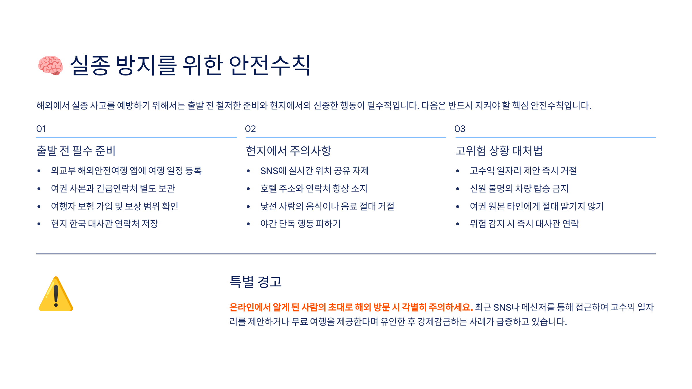 해외에서 실종되는 상황은 대부분 ‘예고 없이’ 찾아오지만, 공통적인 패턴은 존재해요. 그걸 알고 준비한다면 충분히 예방할 수 있어요.