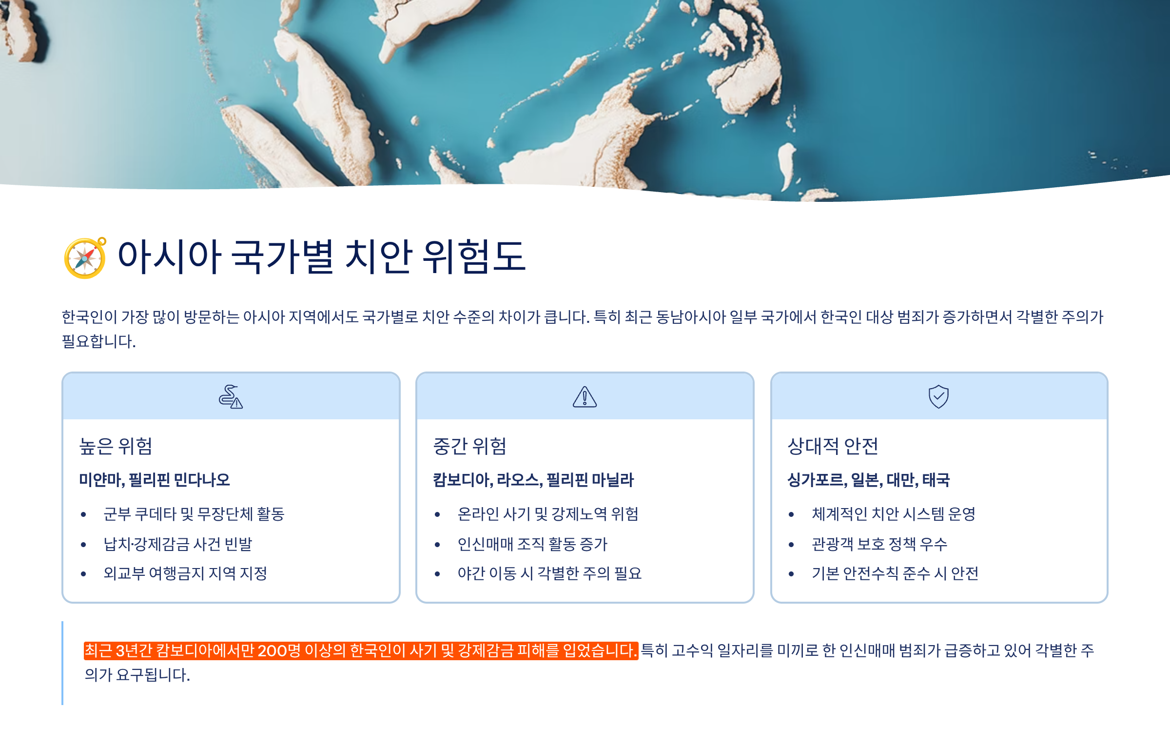 아시아 지역은 여행지로 인기가 많지만, 모든 국가가 안전한 건 아니에요. 특히 캄보디아, 필리핀, 미얀마는 최근 몇 년 사이 한국인을 포함한 외국인 실종·납치 사건이 급증한 지역이에요.
