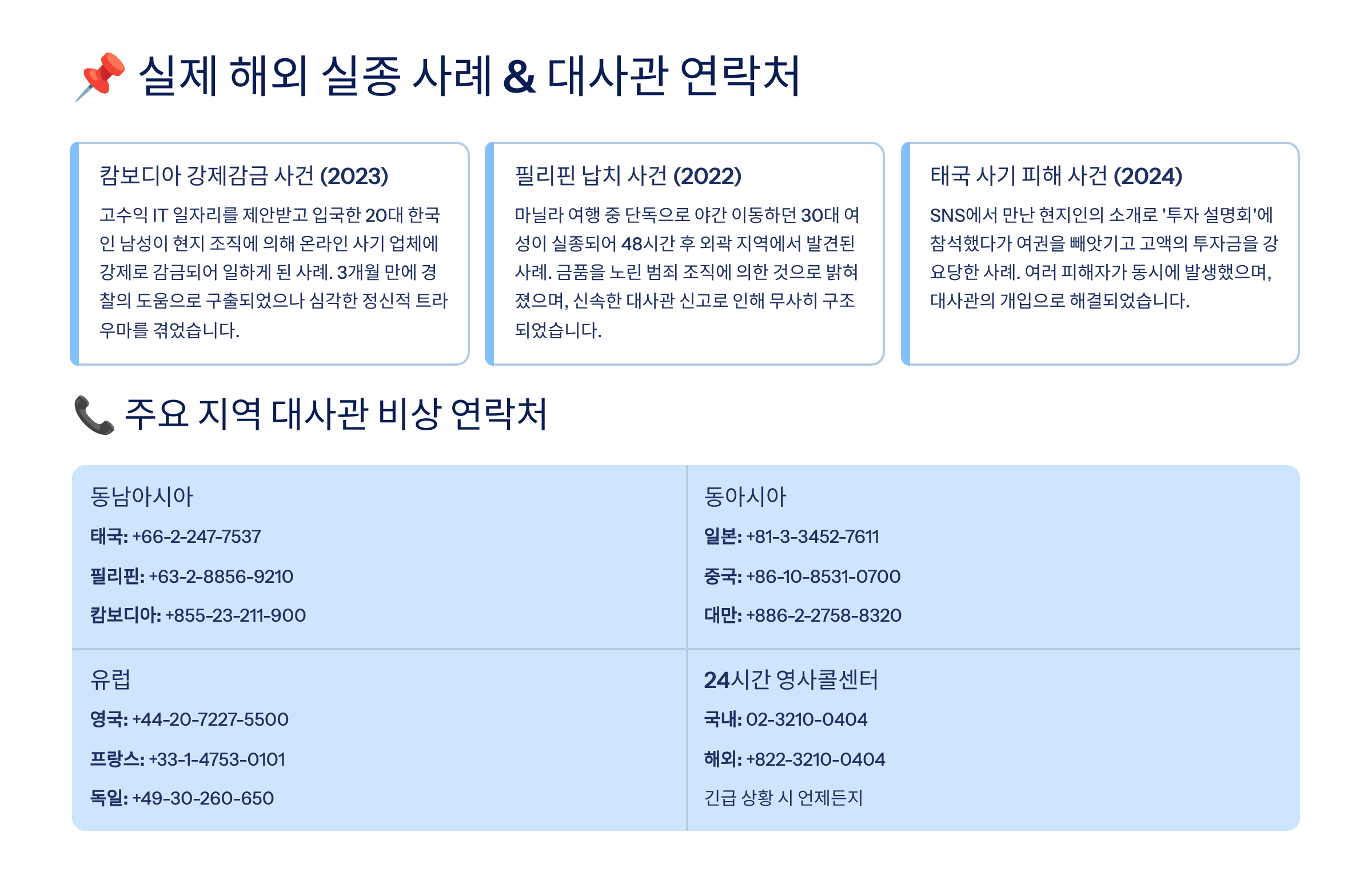특히 중남미와 동남아, 중동 지역은 실종·범죄·보이스피싱·내전 위험까지 복합적으로 얽혀 있는 지역이 많답니다.